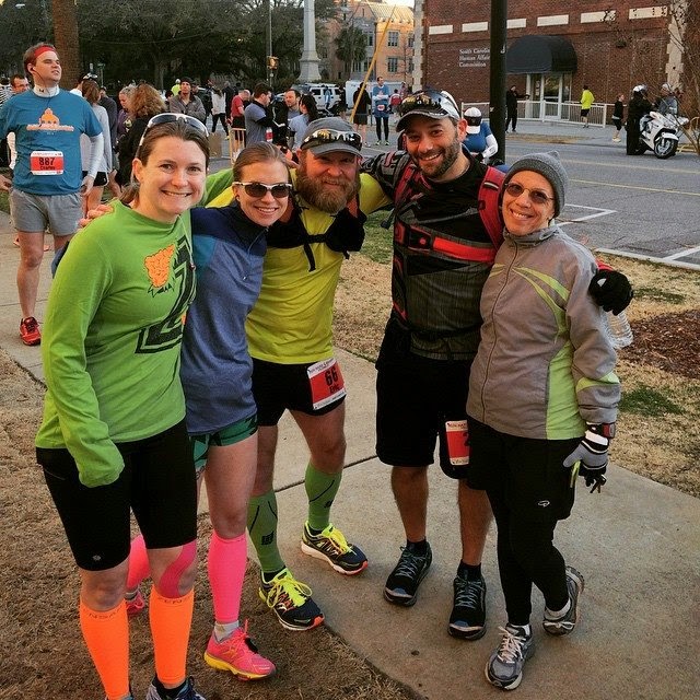 I went for a short 2.5 mile shakeout run along the campground roads in the morning, then around noon I walked a two mile loop around the campground lake. It was a gorgeous day. I eventually made it to the race expo to pick up my race packet and ended up seeing one of the good friends I was going to be meeting earlier, Jennifer! See, the whole reason I registered for this race was to finally meet some of my good friends from an online running team, the Free Agents, that I've been a member of since 2008. Jennifer was leaving the expo, but parked and came back inside so we could chat some. Talk about good southern hospitality! After I picked up my packet and we talked with one of her friends, we went our separate ways until meeting up with the rest of the gang at dinner.